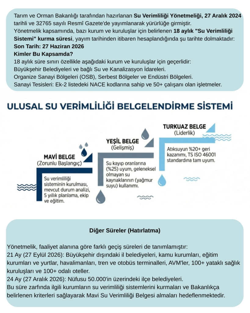 27 Aralık 2024’te yürürlüğe giren “Su Verimliliği Yönetmeliği” ile sanayi tesisleri, belediyeler ve büyük ölçekli binalar için yeni bir dönem başladı. İşletmeniz için kritik eşik Haziran 2026.